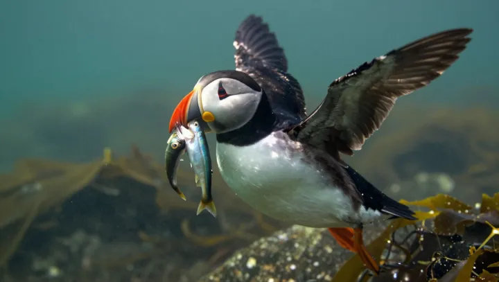 Атлантический тупик срывается с воздуха, поджимает лапы и врезается в море, словно живой снаряд. Под поверхностью те же крылья, которые в момент взлета кажутся неуклюжими, работают короткими, плотными дугами, создавая подъемную силу и тягу уже в воде, а не в воздухе. Птица превращается в подводного летуна, маневрирующего в тусклой толще, пока ее клюв сверкает аккуратно уложенной шеренгой серебристой рыбы.