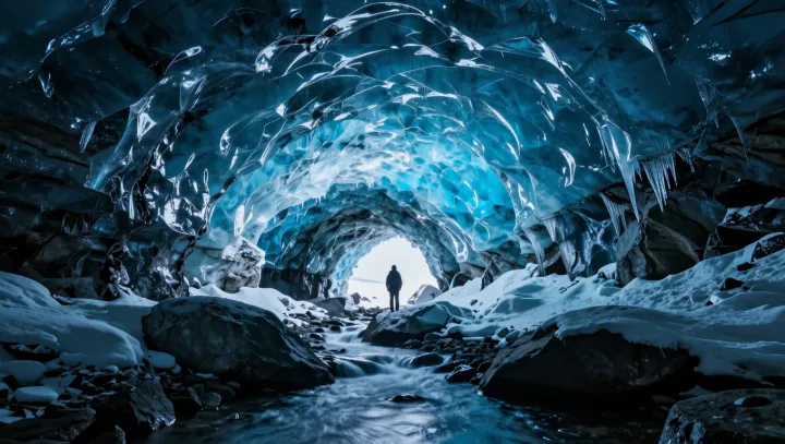 Сверкающий ледяной потолок способен течь, менять форму и при этом оставаться устойчивым. Ледниковый лед ведет себя как вязкоупругий твердый материал: под действием постоянной силы тяжести он медленно ползет, а не рушится внезапно, если смотреть на это в человеческих масштабах времени.