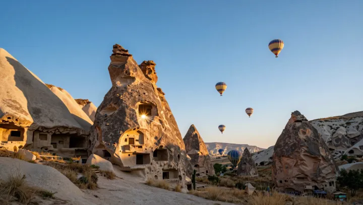 Мягкий утренний свет ложится на каменные шпили и выдолбленные склоны, а над ними почти беззвучно плывет россыпь воздушных шаров. Картина кажется хрупкой и нереальной, хотя на самом деле это итог яростных вулканических извержений и многовековой эрозии, которые превратили Каппадокию в мир хребтов, каменных «труб» и чашеобразных впадин, рожденных за колоссальные геологические промежутки.