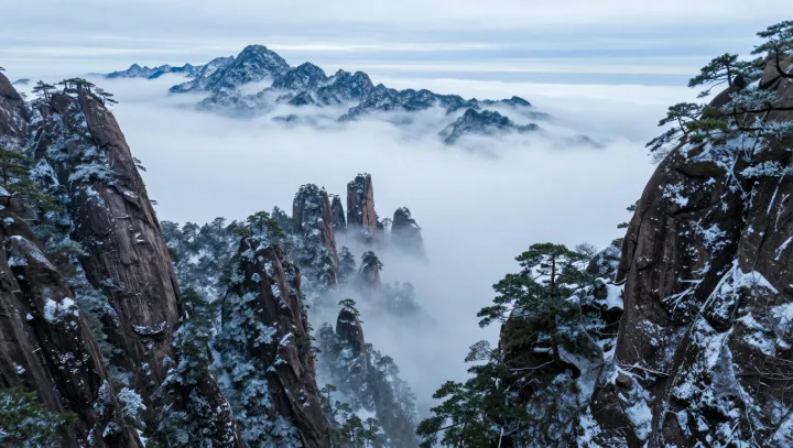 Один и тот же гребень горы Хуаншань может выглядеть как два совершенно разных мира. В один момент он читается как застывшая тушевая миниатюра — голый гранит, резкий контраст, темные силуэты сосен. Спустя несколько часов, когда меняются только облака и температура, сцена расплывается в мягкие цвета и подвижную глубину. Гора остается неподвижной, а ее атмосфера снова и снова переписывает происходящее.